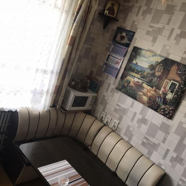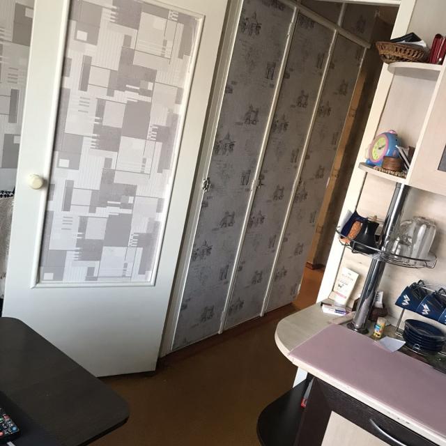 Квартира в нормальном, жилом состоянии (2 стеклопакета, на полу линолеум, на потолке плитка, новый унитаз, счетчики ХГВ, новый электросчетчик, остается встр. кухня+техника), есть отдельная кладовка - увеличенная за счет коридора. Соседей нет, только сверху.