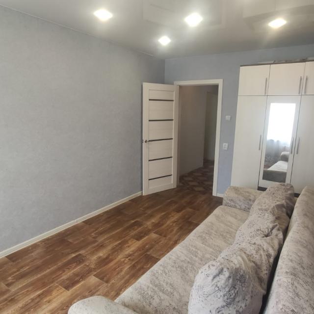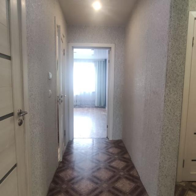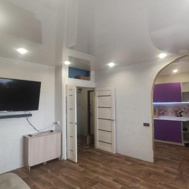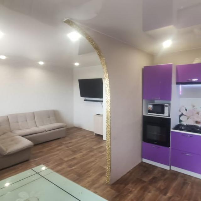 Квартира в хорошем состоянии, на две стороны, солнечная, теплая (стеклопакеты, линолеум, меж.двери, натяжные потолки, санузел раздельный в кафеле, балкон остеклен стеклопакетами, остается встроенная кухня+техника)